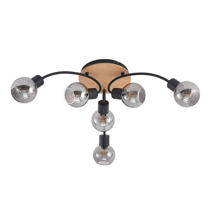 De Eridia 6 Ronde Plafondlamp Zwart/Hout is een mooi en veelzijdig verlichtingsmodel met een eenvoudig en discreet ontwerp en een neutrale, donkere kleurstelling die gemakkelijk in een groot aantal kamers past. Het zwarte stalen Statief geeft de lamp een stoere uitstraling, die harmonieus wordt gecompenseerd door de ronde, rookkleurige glazen schermen. Het glas heeft een fascinerende oppervlaktestructuur die op sommige plaatsen mat is en op andere helder, waardoor de lichtbron binnenin gedeeltelijk zichtbaar is. Wanneer de lamp wordt ingeschakeld, komt het licht door de schermen naar buiten in een gezellige en diffuse gloed, en door een opening aan de onderkant van elke lampenkap voor praktische directe verlichting.